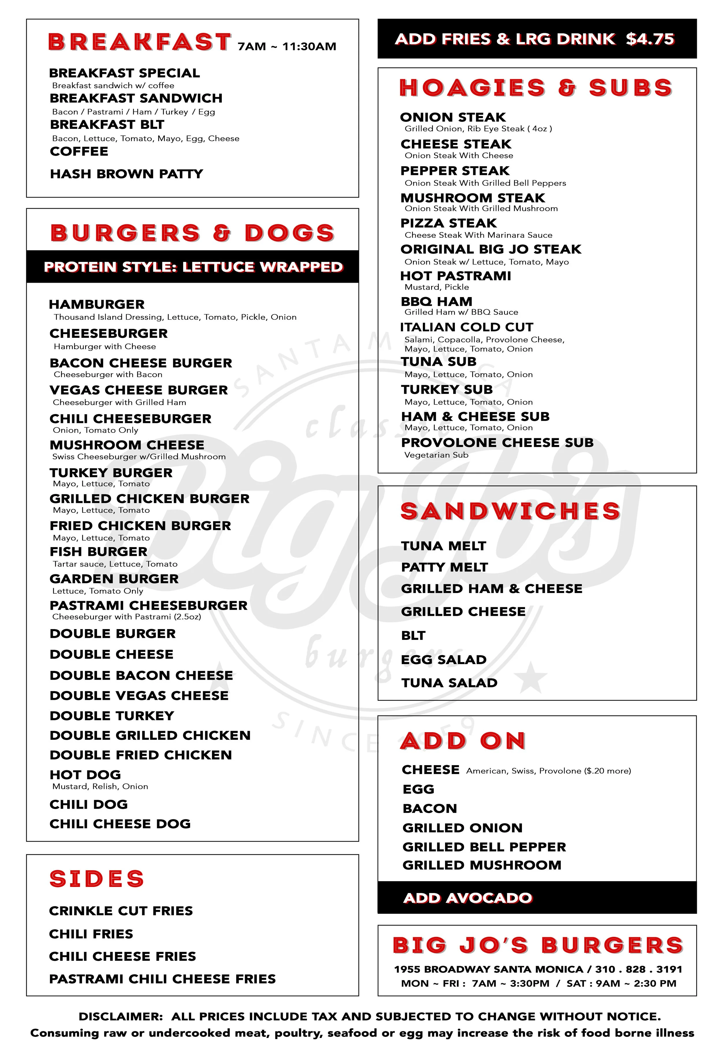 Big House Burgers Menu and Prices No matter what you are hungry for youll find a huge variety of delicious dishes to satisfy you at the Big House Burgers menu. Big House Salad Iceberg and spring mixed lettuce with carrots cherry tomato cucumber ham cheese and a boiled egg. Big House Burgers open daily 11am - 8pm for lunch and dinner.
